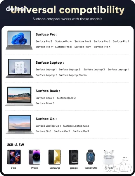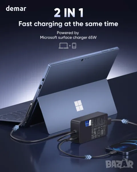 Това зарядно устройство Surface с мощност 65 W разполага с магнитен щепсел за стабилно, високочувствително зареждане с интелигентно регулиране на изходната мощност (65 W, 44 W, 39 W, 36 W, 24 W) в зависимост от устройството, като същевременно предлага USB порт за едновременно зареждане на телефон. Съвместимо е с широка гама от модели, включително Surface Pro 3–10, Surface Pro X, Surface Laptop 1–6, Surface Book 1–3, Surface Go 1–4 и Surface Laptop Studio. Проектирано да поддържа различни изходи на зарядни устройства (65 W, 44 W, 39 W, 36 W, 24 W) и модели като 1735, 1736, 1796 и други, то гарантира безопасност с вградена интелигентна чип технология, предлагаща защита от претоварване и късо съединение, поддържайки сигурно и надеждно зареждане за вашето устройство.