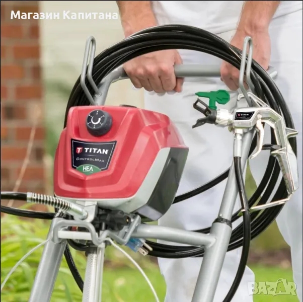 Пръскачка TITAN ControlMax® 1900 PRO Cart работи с захранване 230 V и максимална производителност 1.5 л/мин. Максимално работно налягане е 110 бара. Новата технология на накрайника на системата HEA намалява свръхразпръскването с до 55 процента, като същевременно осигурява по-меко пръскане, подобрява контрола и осигурява по-устойчиво покритие. Издръжливата и мощна HEA помпа с мощност 0,70 конски сили може да пръска неразредени покрития с възстановяема флуидна секция, която увеличава максимално живота на машината. Тя разполага с издръжлива стоманена опора с телескопична дръжка . Улесняващи работата са бутон за управление на налягането ON/OFF, пистолет с удобна дръжка и лесен за натискане спусък, както и филтър за боя, предпазващ от запушване на помпата.