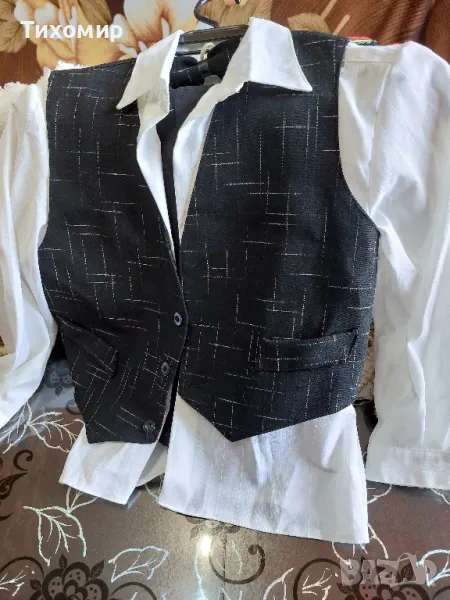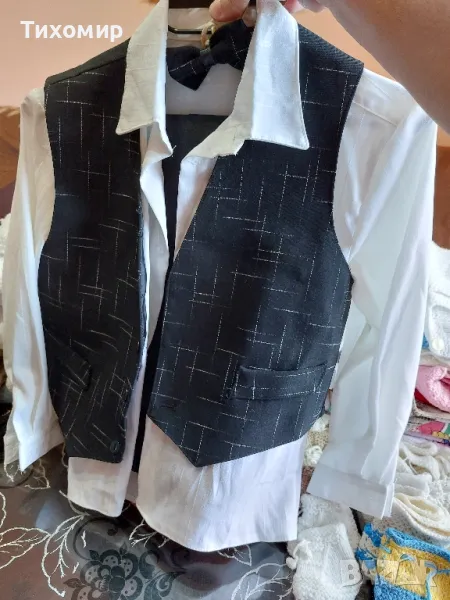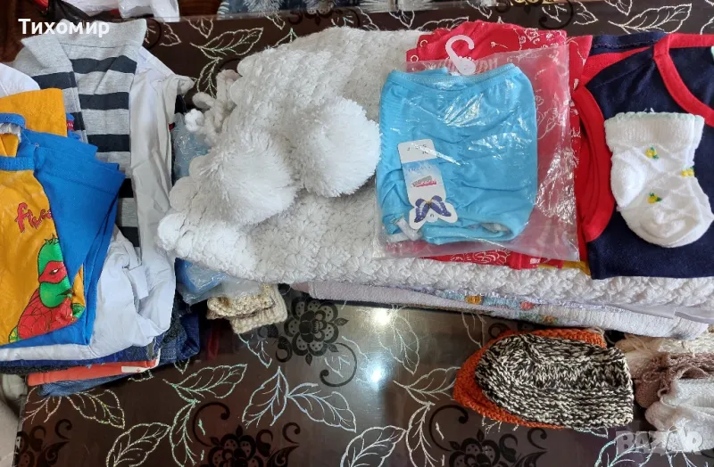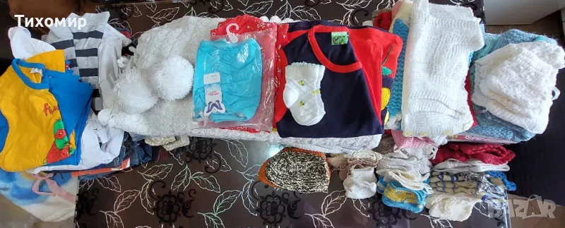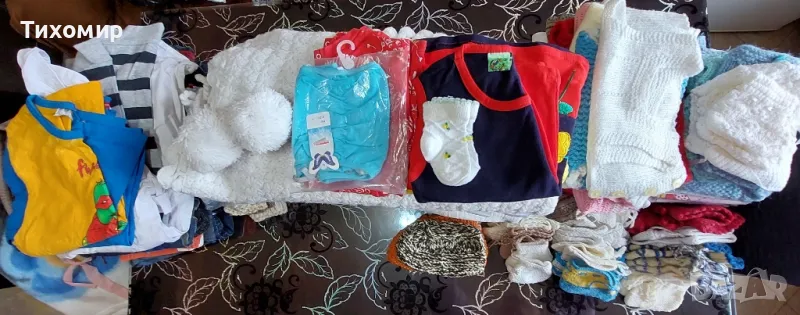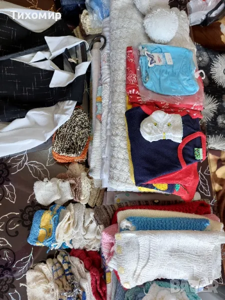 Детски одеяла/ тънки, дебели/, плетена пелена; детски чаршафи, калъфки; плетени терлици; плетени елечета / нови и носени/; плетени чорапи; клинче; дънки; блуза за момче; комплект- бяла риза, черен панталон, елече.