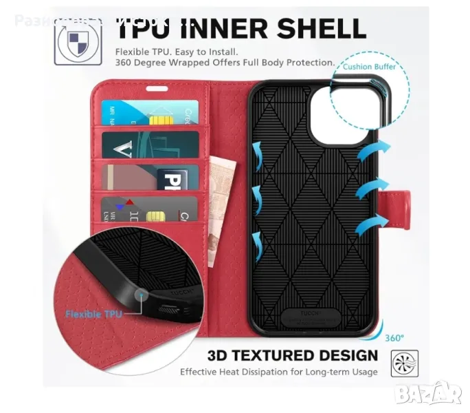 Калъф-портфейл TUCCH за iPhone 15 6.1", [RFID блокиране] [4 слота за карти] Защитен калъф от TPU, магнитно закопчаване, удароустойчив калъф от PU кожа със стойка, червен
