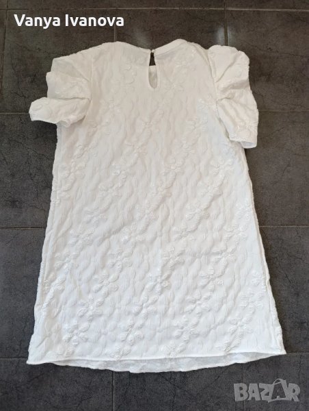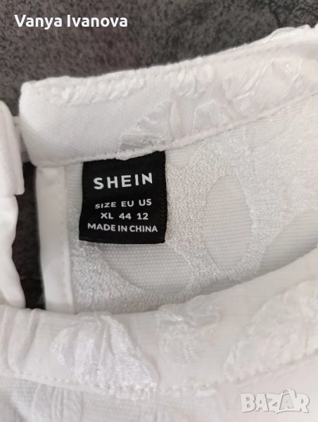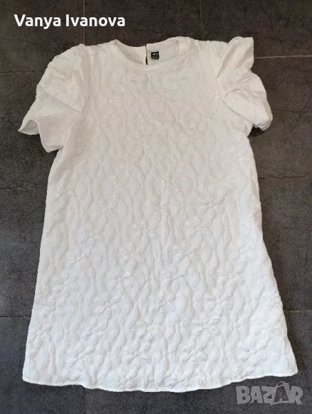 Бяла минималистична рокля от shein.Роклята е с френски ръкав и а силует, не описва и не прозира ,има бели релефни цветя ,което я прави много нежна и може да се съчетава със сандали , обувки и сникърси.Размер хл.Обличана е веднъж , няма забележки.
