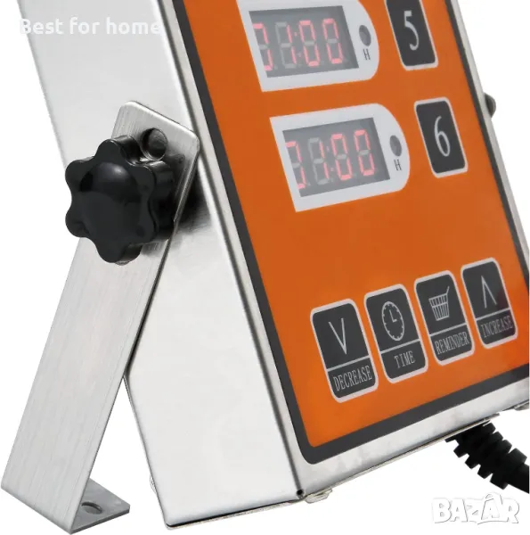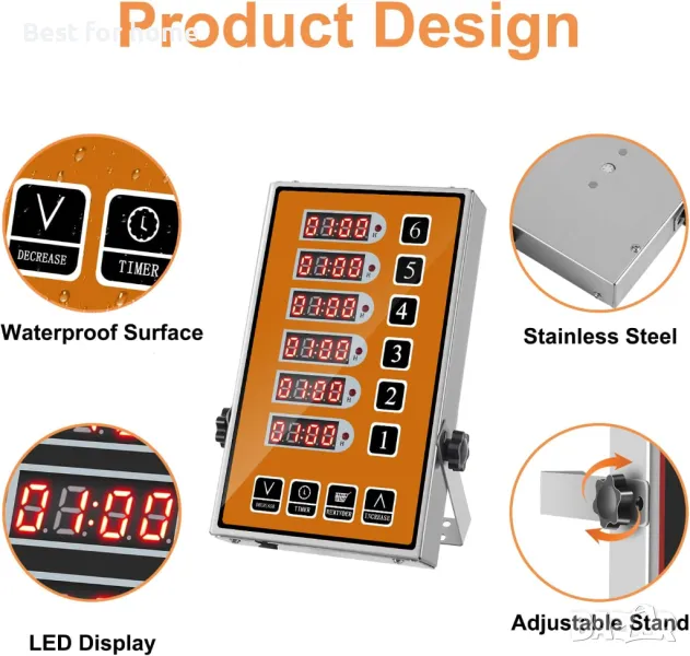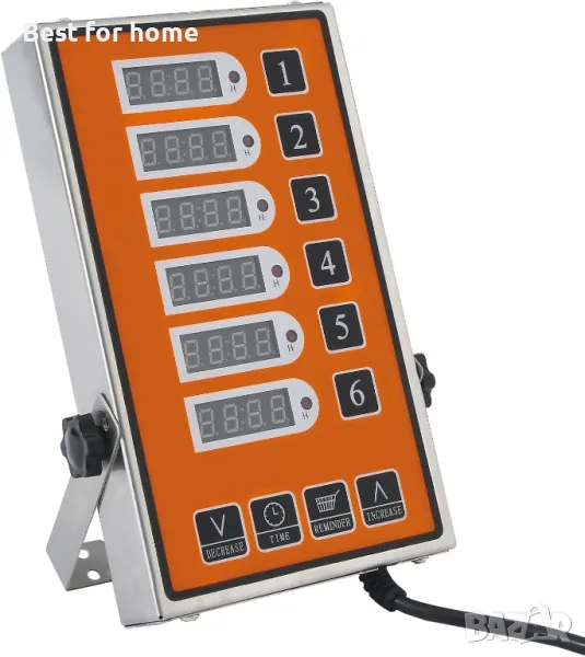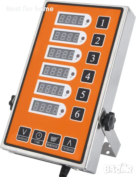 YOOYIST Commercial 6-Channel Kitchen Timer е професионален цифров кухненски таймер, предназначен за ресторанти, кафенета и камиони за храна. Разполага с 6 независими таймера, които могат да бъдат настроени да контролират различни кухненски операции едновременно. Таймерът разполага с LED дисплей, който е лесен за четене, и също така идва с високоговорител с регулируема сила на звука, което ви позволява да персонализирате звука на алармата според вашите нужди. Таймерът е проектиран с издръжлив и здрав метален корпус, за да издържа на тежки кухненски среди. Освен това е водоустойчив и може лесно да се избърше. Прави го подходящ за широк спектър от приложения в кухни, ресторанти и фритюрници. Търговският 6-канален кухненски таймер YOOYIST е основен инструмент за всяка професионална кухня или работа с камиони за храна.