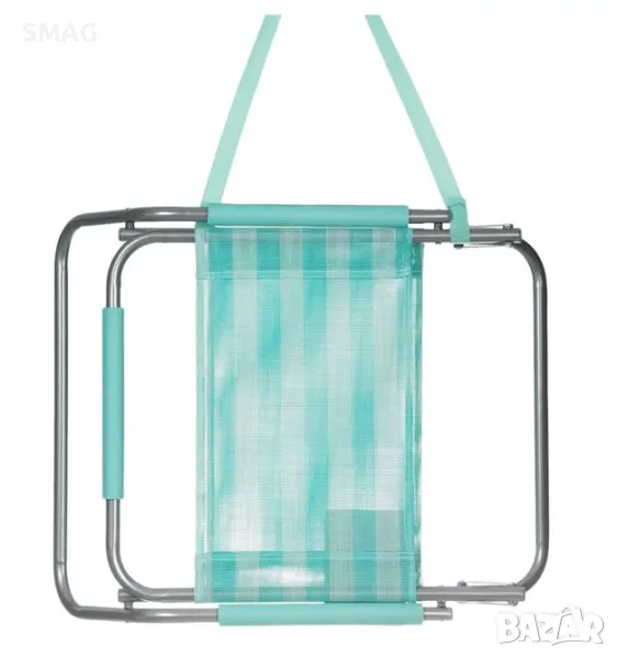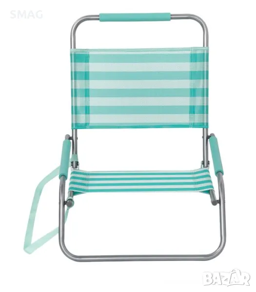 Плажен стол с дръжки, стоманена рамка и раирана тюркоазена EVA материя. Дръжките и горната част на гърба са меко облицовани с пяна, за да почиват ръцете и главата ви по-удобно. Затваря се, за да се прехвърля лесно от каишката в същия цвят.