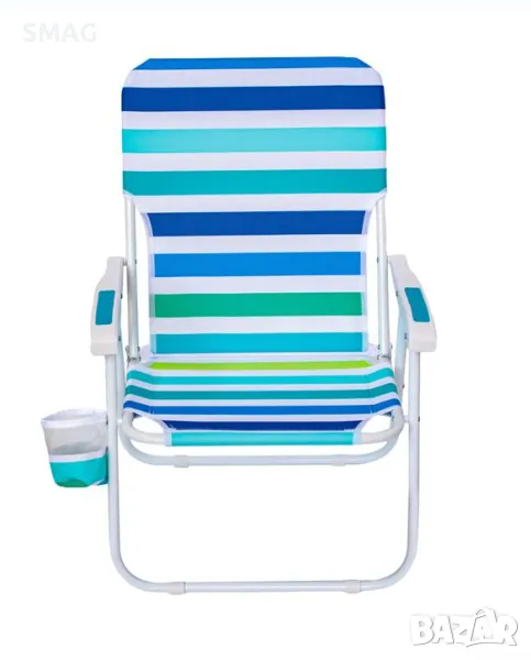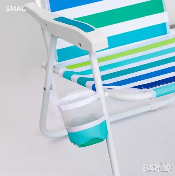 Плажен стол с бели пластмасови дръжки, сгъваем, с бял полиестерен плат с райе дизайн в син, светлосин и зелен цвят и издръжлива метална рамка. На дясната дръжка има калъф за бутилка 11х11см. Затваря се, за да се транспортира лесно с колана в бяло.