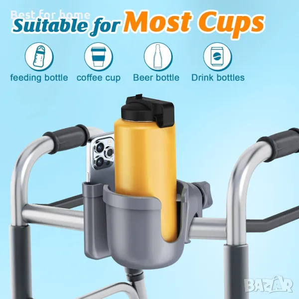 Приложими сценарии: Поставката за чаша за инвалидна количка с поставка за мобилен телефон е подходяща за повечето детски колички, проходилки, инвалидни колички, велосипеди, скутери, дръжки за лодки, пазарски колички, каяци, ATV, косачки, мотоциклети, бягащи пътеки, колички за голф, комби и др.