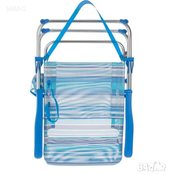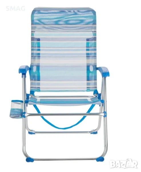 Плажен стол със сини пластмасови дръжки, сгъваем, с раирана текстилна материя и издръжлива алуминиева рамка. Облегалката се регулира на 4 позиции за по-удобна позиция на плажа. На дясната дръжка има поставка за бутилки 11х11см. Затваря се, за да се транспортира лесно с каишката в синьо.
