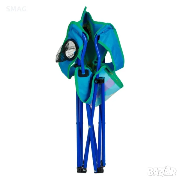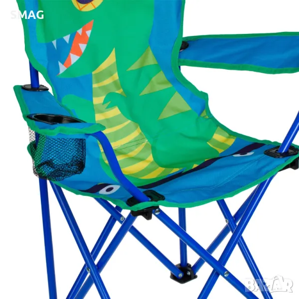 Сгъваем стол за къмпинг за деца, със здрава рамка с 0,7 мм пръти, 56 см облегалка за ръката и издръжлива тъкан 600 D с PE покритие. Има поставка за чаша на дясната облегалка и дизайн на динозавър. Сгъва се за лесно съхранение и има чанта за носене.