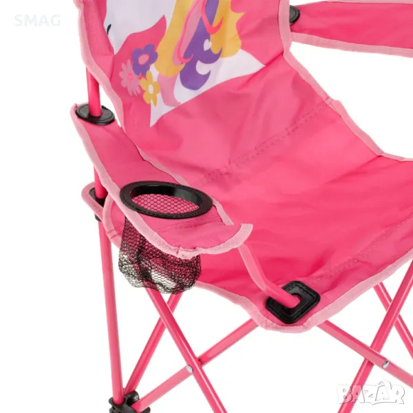 Сгъваем стол за къмпинг за деца, със здрава стоманена рамка с 0,7 мм пръти и издръжлива тъкан 600 D с PE покритие. Има поставка за чаша на дясната облегалка и дизайн на еднорог. Сгъва се за лесно съхранение и има чанта за носене в цвят фуксия с черна дръжка (79x23 см).