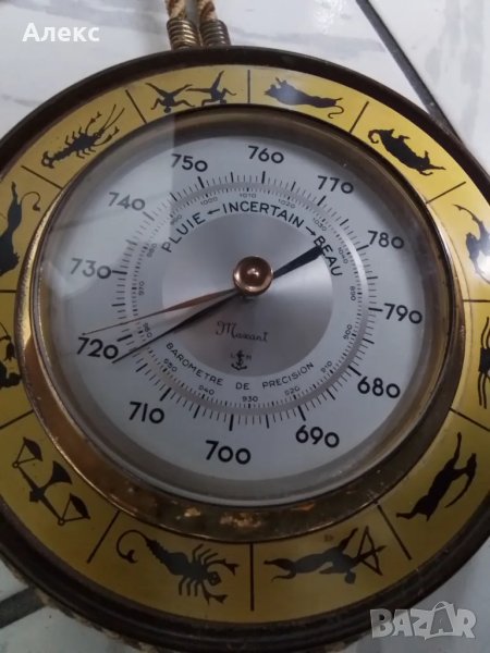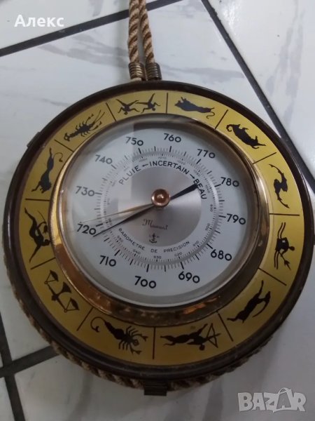 Продавам много красив френски барометър с морска емблема в дървена основа,диаметър на дървената основа 16 см,на барометъра 10см,всичко работи.
