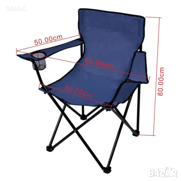 Сгъваем стол за къмпинг със здрава рамка с 0,8 мм прът и издръжлива тъкан 600 D с PE покритие. Има поставка за чаша на дясната дръжка и перфорирана част в средата на седалката. Сгъва се за лесно съхранение и има чанта за носене.