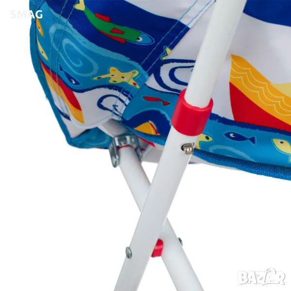 Детско кресло с весел морски дизайн с лодки и рибки. Има метална рамка и неплъзгащи се постелки и се затваря за лесно съхранение и транспортиране навсякъде. Материята е водоустойчива и лесна за почистване.