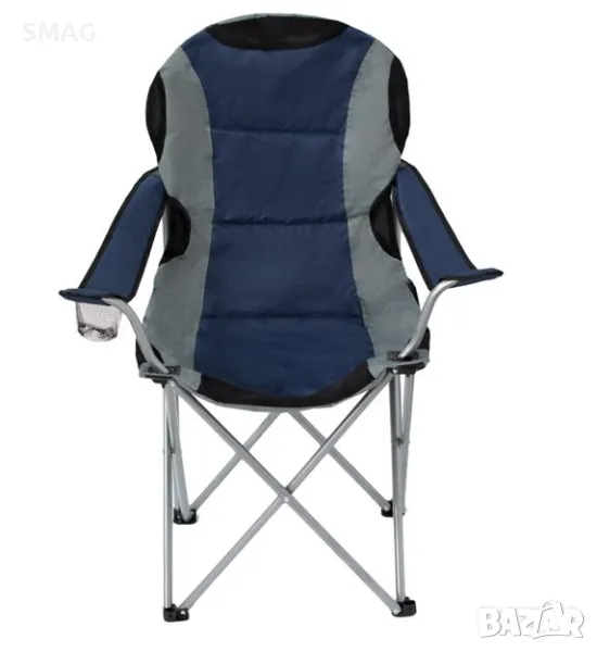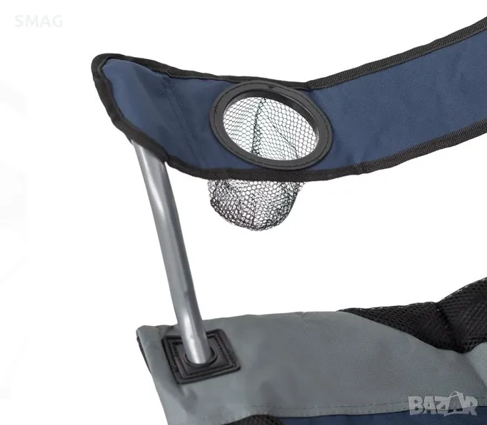 Сгъваем къмпинг стол в антрацит/син цвят, със здрава стоманена рамка и издръжлив оксфордски 600D плат с PE покритие. Има поставка за чаши на дясната дръжка и детайли с мрежа. Сгъва се за лесно съхранение и има чанта за носене с дръжка.