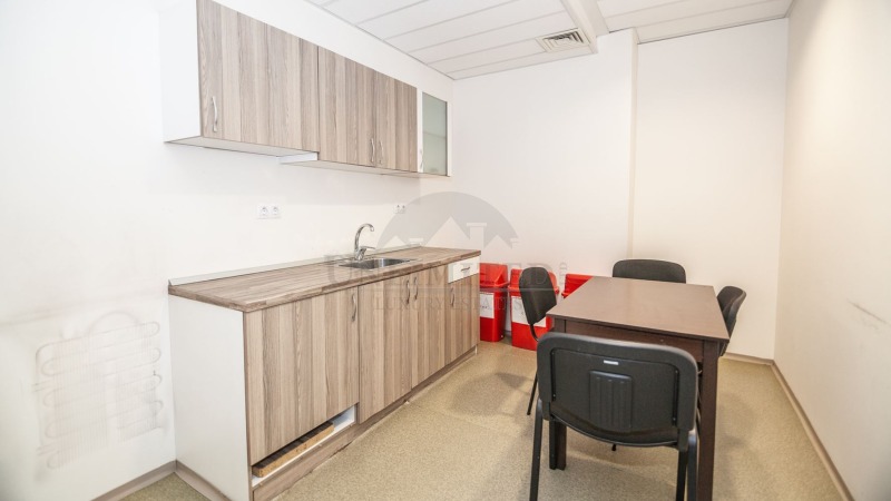 Разпределение: 8 отделни работни помещения, оборудван кухненски бокс, сървърно помещение, 4 тоалетни .Възможна е преконструкция на остъкляването и може да стане Open space.