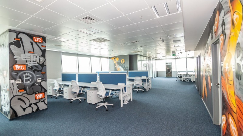 Layout: Large open space room, 8 separate work rooms, kitchenette, server room, 8 toilets.