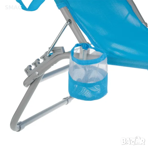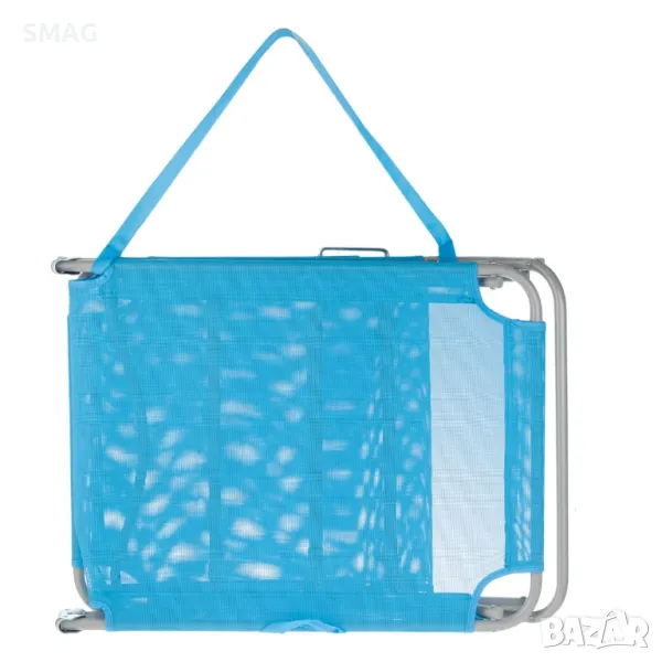 Плажен шезлонг с тюркоазен перфориран текстилен плат и издръжливи шевове. Наклонът на облегалката се регулира на 3 нива, пада напълно надолу и има практични дръжки за носене.