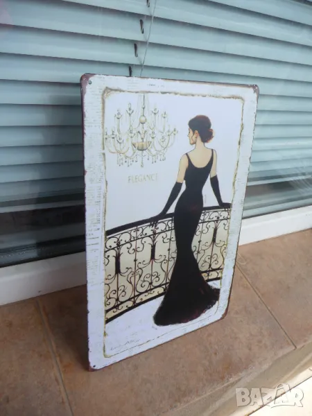 Метална табела мода дълга черна рокля балкон полилей парти бал елегантна стилна