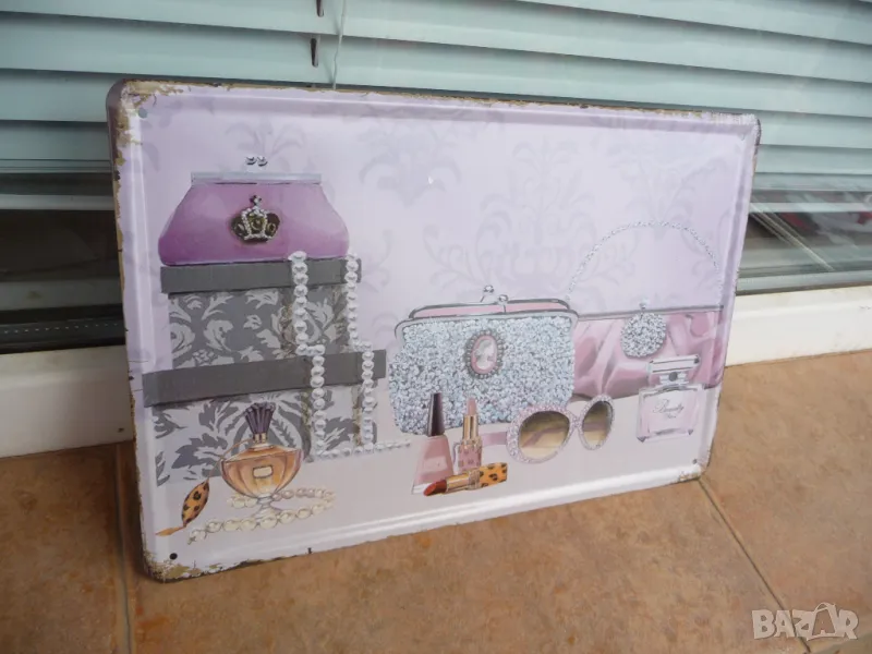 Метална табела мода бижута червило лак слънчеви очила парфюм чанта перли бижута
