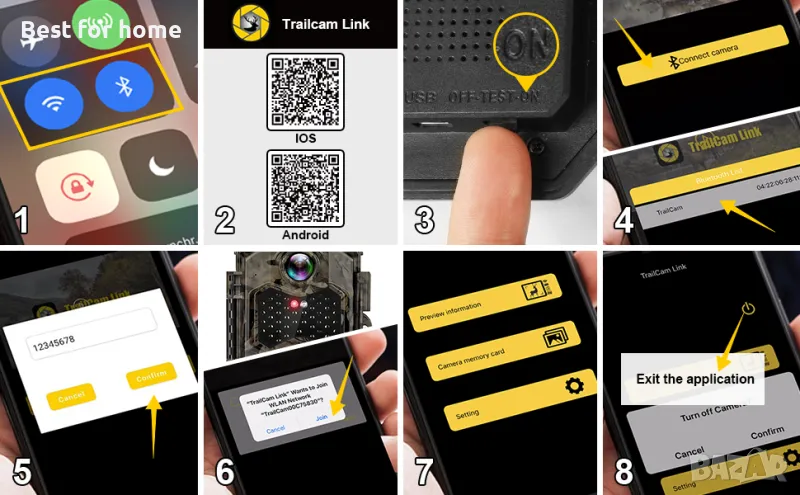 (1) Камерата за лов не може да бъде свързана към приложението чрез домашен Wi-Fi, а само чрез Wi-Fi, който е включен в комплекта на камерата за дивата природа.