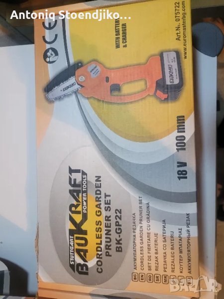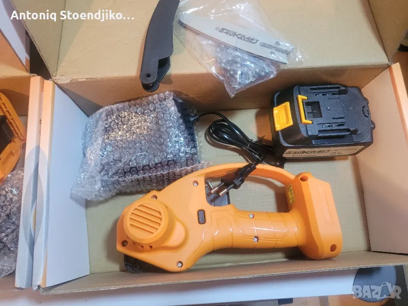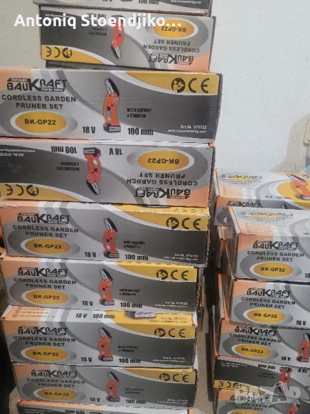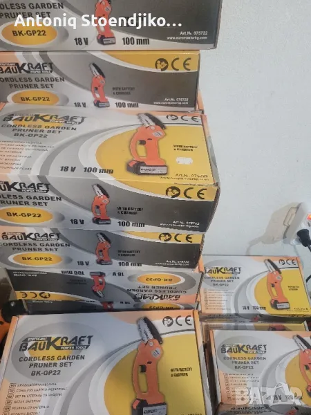 Трионите са нови не са ползвани, може да се пратят разглобени, може и зглобени готови за работа. Цената е за един комплект трион, който включва трион ,батерия 4 амперчаса, зарядно устройство, и комлемт за зглобяване. Пращам по Еконт и Спиди с преглед и тест преди плащане. Характеристика:Акумулаторен трион за клони със стъпка на веригата 1/4"Акумулаторна кастрачка Baukraft BK-GP22 Set се доставя с батерия Li-Ion с напрежение 18 V, капацитет 4 Ah и зарядно устройство. Батерията е без мемори ефект. Трионът за клони има дължина на шината 10 см и стъпка на веригата 1/4". Оборудван е с предпазен капак за безопасна употреба, висококачествена режеща верига, осигуряваща бързо и гладко рязане и ергономичен дизайн за лесно опериране с една ръка. Топлината се отвежда отлично благодарение на вентилационните отвори, а блокировката на пусковия прекъсвач предотвратява неволно включване. Доставя се в комплект с батерия и зарядно устройство.Технически параметри:Номинално захранващо напрежение: 18 VДължина на шината: 10 смСтъпка на веригата: 1/4"Дебелина на водещите звена: 1.1 ммБрой на водещите звена: 28Скорост на веригата: 5.8 м/секТегло: 1.18 кг