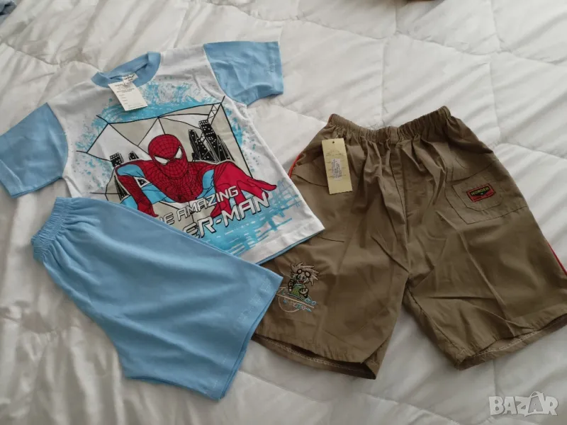 Нови комплектче къс панталон и тениска/98 и къси панталони размер 98,според мен и двете са уголемени и отговарят на 104