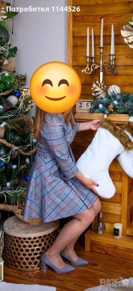Разкроена офис рокля в сив цвят на каре, с джобчета и колан. Турска качествена конфекция. Размер S, няма никакви забележки.