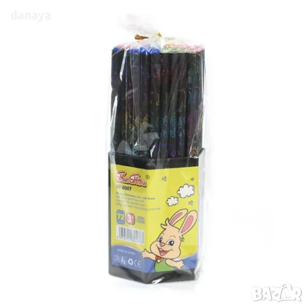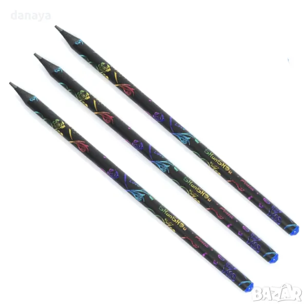 Този графитен молив с черен корпус и цветни надписи е идеален избор за ученици, художници и всеки, който обича да пише или скицира с лекота. Черният корпус с цветни надписи не само че придава уникален стил, но и прави молива лесен за разпознаване сред останалите. Висококачественият графит осигурява плавно писане и равномерно нанасяне на цвета, което го прави подходящ за писане, рисуване, скициране, чертане и бележки.