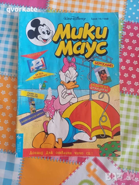 СНИМКА № 14 Списание Мики Маус бр.16/1998г.,изд.Егмонт България,меки корици,състояние:на стр.6 прегъната,стр.11 изрязан правоъгълник-текстта се вижда,стр.29 само срязано,намачкани корици.-5.00лв.