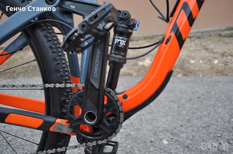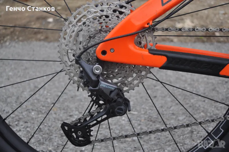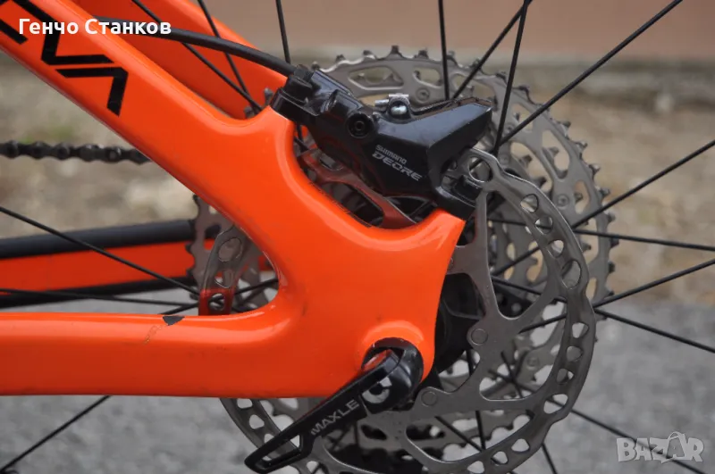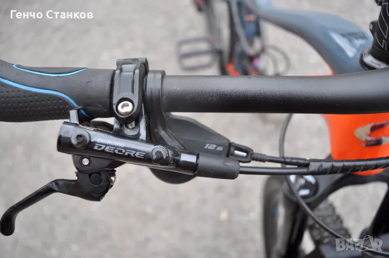 амортисьори. Много стегнат и перфектно оборудван с 12 скоростната система на Shimano Deore. Спирачките са брутално добри-Smimano Deore, като предната е двубутална. Амортисьорите са с огромен ход,