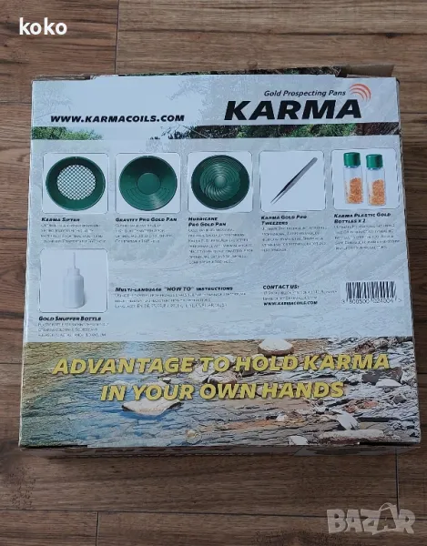 самородно златоKarma Ultimate Pro Package - комплект за търсене на самородно златоKarma Ultimate Pro Package - комплект за търсене на самородно златоЕКСПРЕСНА ПОРЪЧКАПоръчай този продукт без да губиш време.Попълнете само вашето име и телефон за контакт и ние ще ви се обадим за да уговорим доставката.Име: Вашето имеТелефон: Телефонен номерПроизводител : KarmaНаличност : В наличност75,00 лв.59,00 лв.КупиДобави към Желани продукт Сравни този продукт( 0 ) Коментара / Напишете коментарОписаниеКоментари ( 0 )Karma Ultimate Pro Package - комплект за търсене на самородно злато Karma Ultimate Pro PackageПрофесионален комплект за промиване на злато. Изработен от висококачествени материали. Иновативен дизайн за максимална ефективност. Леки и с удобен 360 градусов захват.Комплект, който е ефективен за промиване на злато на сухо и във вода.Комплектът включва:Karma Gravity Gold Pan – класически леген с вертикални капани за улавяне на злато – 35 смKarma Hurricane Gold Pan – иновативен леген със специален дизайн, с който още по-лесно да промивате злато. Наличие на вертикални капани за фино финално промиване на злато – 37 смKarma Sifter – сито с оптимална големина на процепите за отсяване на ненужните едри камъни и боклуци от материала за промиване