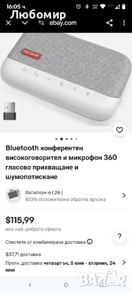 NUROUM A15 Bluetooth конферентен високоговорител и микрофон, подобрено 360° гласово улавяне и шумопотискащо компютърно високоговорител с 4 MEMS микрофона, Daisy Chain, w/Dongle, USB Plug & Play.Свържете 2 конферентни високоговорителя A15 със специалния кабел на Nuroum, за да работите лесно в малки срещи (под 8 участници) и средни до големи срещи (до 16 или повече участници). В сравнение с безжичната връзка, нашата технология за кабелна връзка е по-стабилна и без смущения от околната среда. (Кабелът за последователно свързване трябва да се закупи отделно. Той автоматично ще се изключи, когато не се използва след един час, за да запази живота на батерията.A15 Bluetooth високоговорител е оборудван с надграден пълен дуплексен цифров микрофон и 4 MEMS микрофона, които могат да улавят глас в радиус от 3 метра и са подходящи за конферентни срещи с 6-10 души.