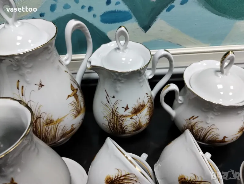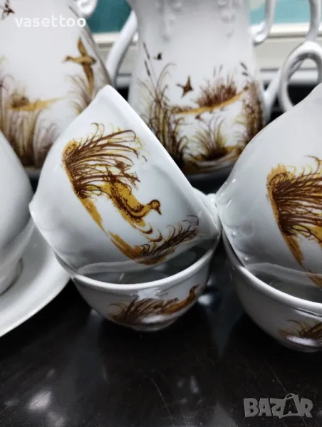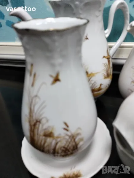 1.Сервиз за дълго кафе/чай с ловни мотиви от шест чаши с вместимост 150мл., чайник, каничка за мляко, захарница и ваза 16 см.-80 лв.Миниатюрна люспа на ръба на чайника.