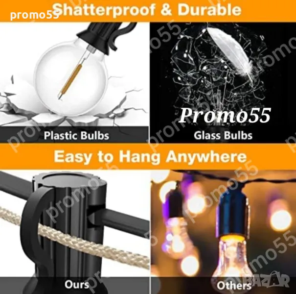 Светлините са изработени от висококачествени материали и водоустойчива технология, безопасни, гъвкави и практични, за да отговорят на нуждите от осветление и декорация на различни поводи. Външните висящи светлини имат 20 нечупливи крушки и са лесни за носене.