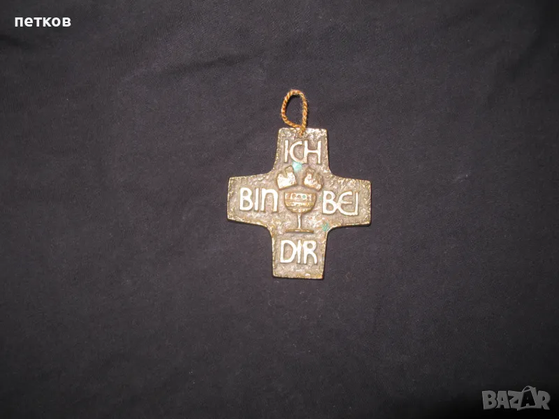 Католически масивен кръст от миналия век. Надпис ”Аз съм до теб” Тегло 135 гр. Височина 8,5 см. Релефен, с възможност за окачване. На снимките се вижда максимално. Благодаря за интереса.