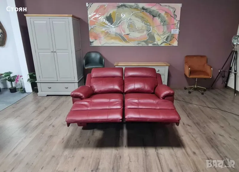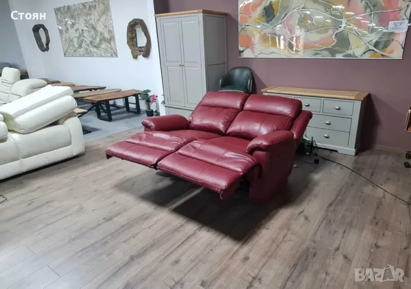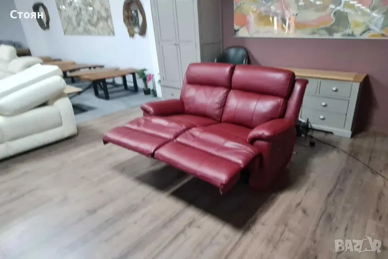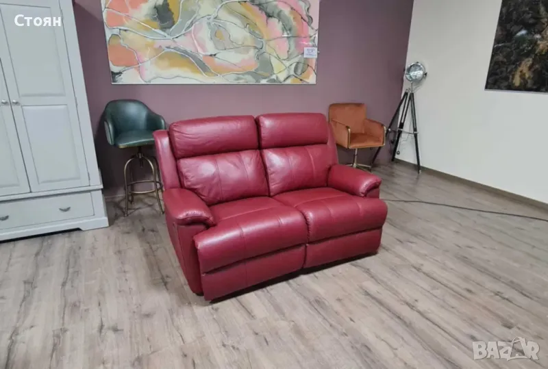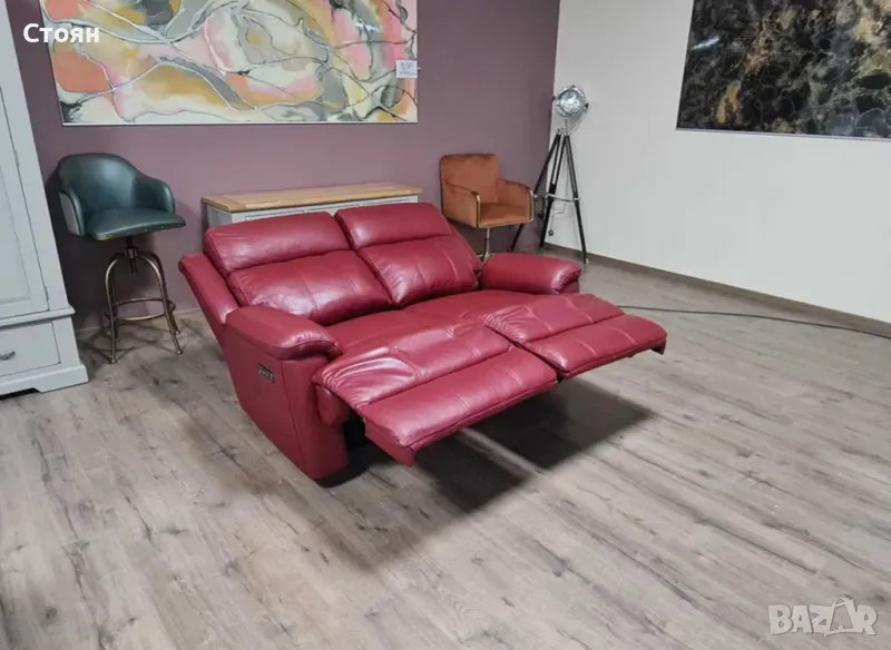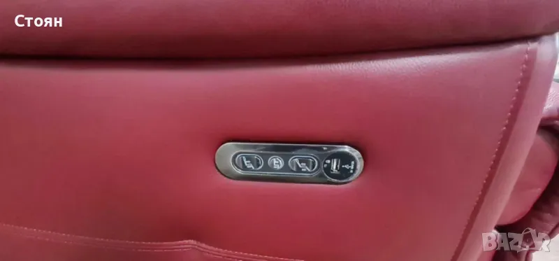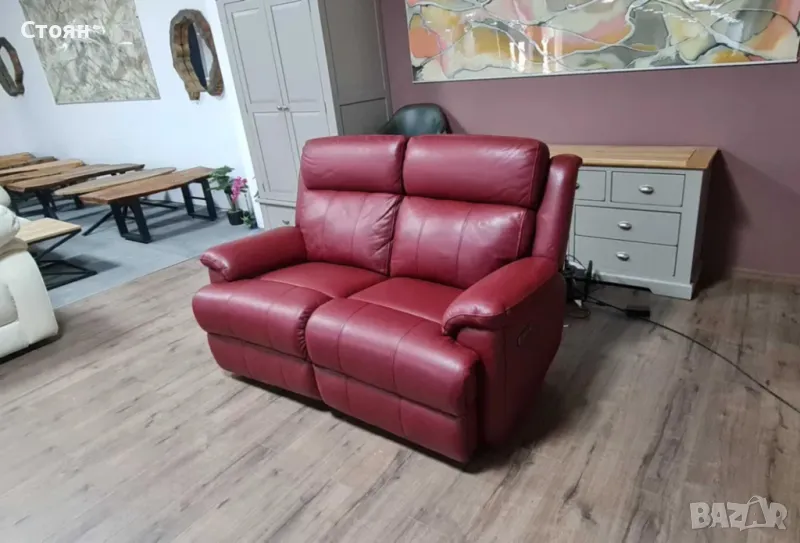 Червен кожен диван двойка с електрически релаксиращ механизъм за краката. 100 % естествена кожа.
