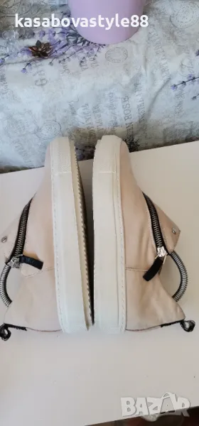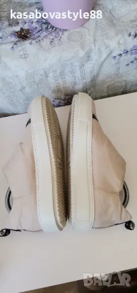 Дамски висококачествени италиански обувки в бежов цвят . Отвътре и отвън изработени от естествена кожа. Обуват се лесно благодарение на циповете. Ходилото е шито и много удобно с височина отзад 4см.Дължина на стелка 24.8см.Цялостна височина отзад 12см.