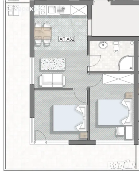 Директно от собственика. Тристаен апартамент А62 (блок А, ет 6) с площ 87,90 кв.м., с разпределение: антре, хол с кухня, 2 спални, баня с тоалетна. Цена: €65200 без ДДС (€78240 с ДДС).