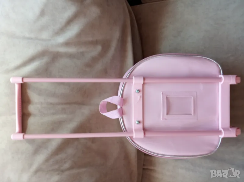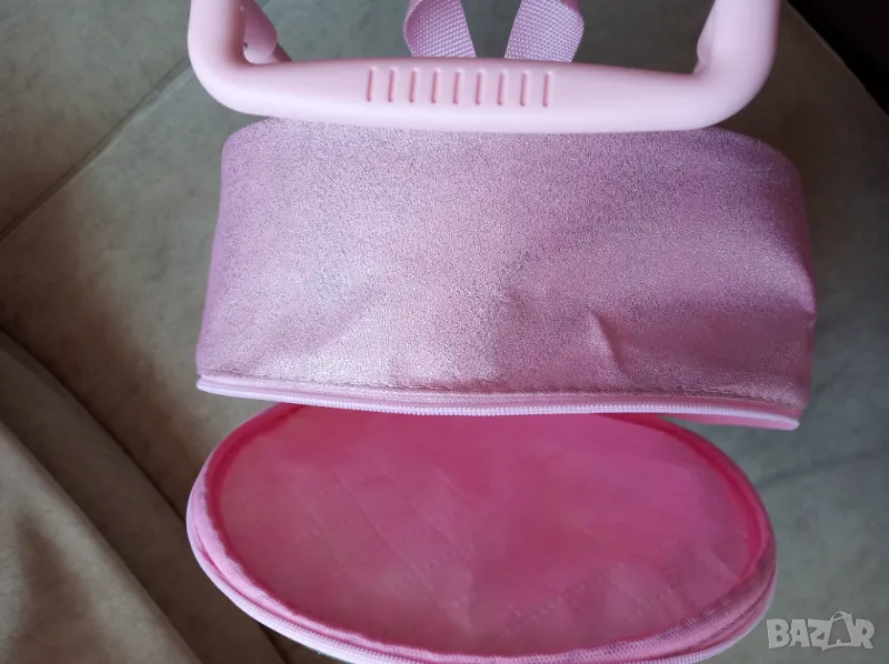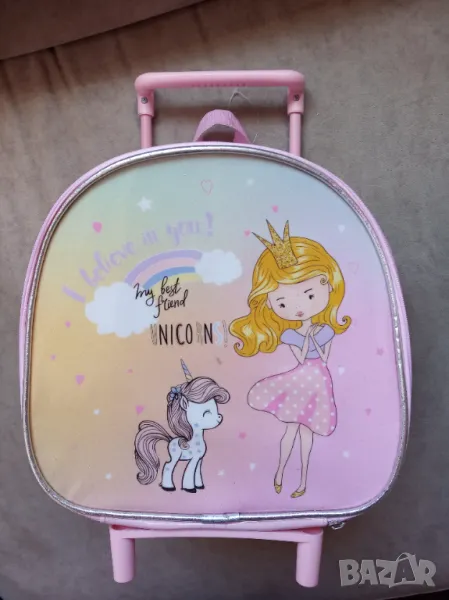 Детска раничка Еднорог с дръжка.Не използвана част от мястото на етикета е на една от снимките.Дължина с дръжката 58 см., височина на раницата 27 см., ширина 27.Дръжката се прибира.