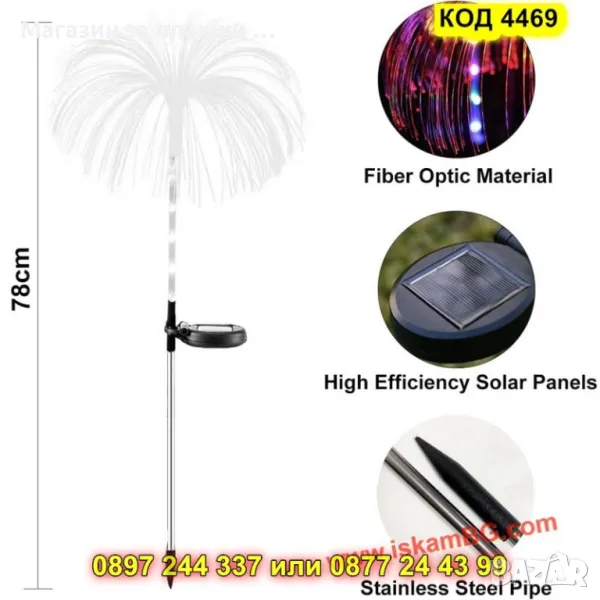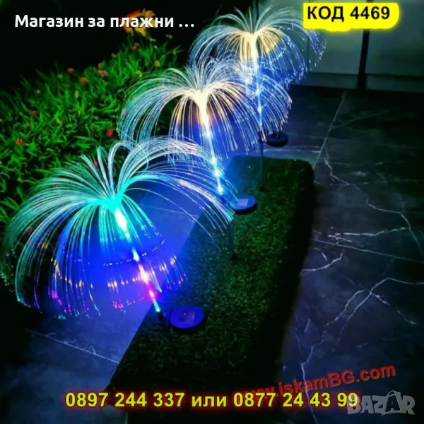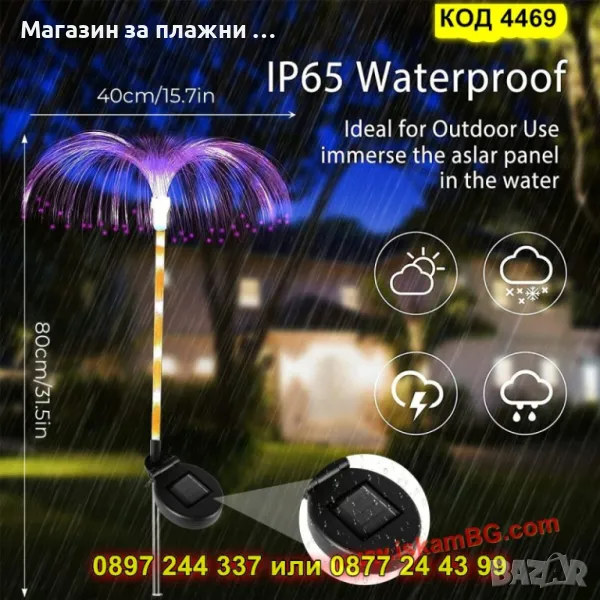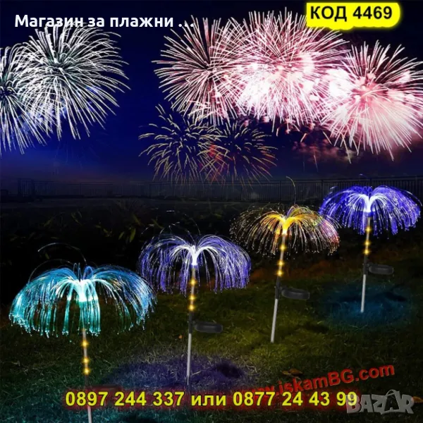 Оригинална градинска соларна лампа във форма на медуза с RGB осветление в 7 цвята. Работи автоматично със сензор за здрач и е изработена от издръжливи материали – оптично влакно, алуминий и ABS пластмаса. Лампата е водоустойчива (IP65) и устойчива на външни условия. Вградената батерия (600mAh Ni-Mh) осигурява до 10 часа осветление след около 4 часа зареждане. Височина – 80 см. Идеална за градини, алеи, дворове и събития на открито.