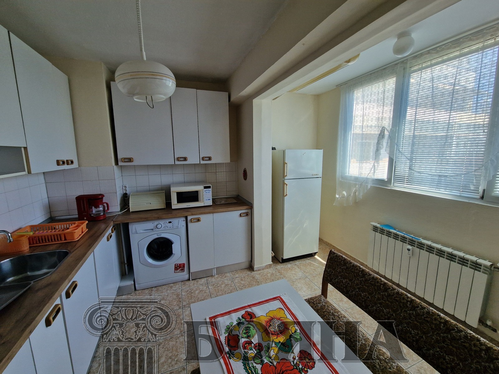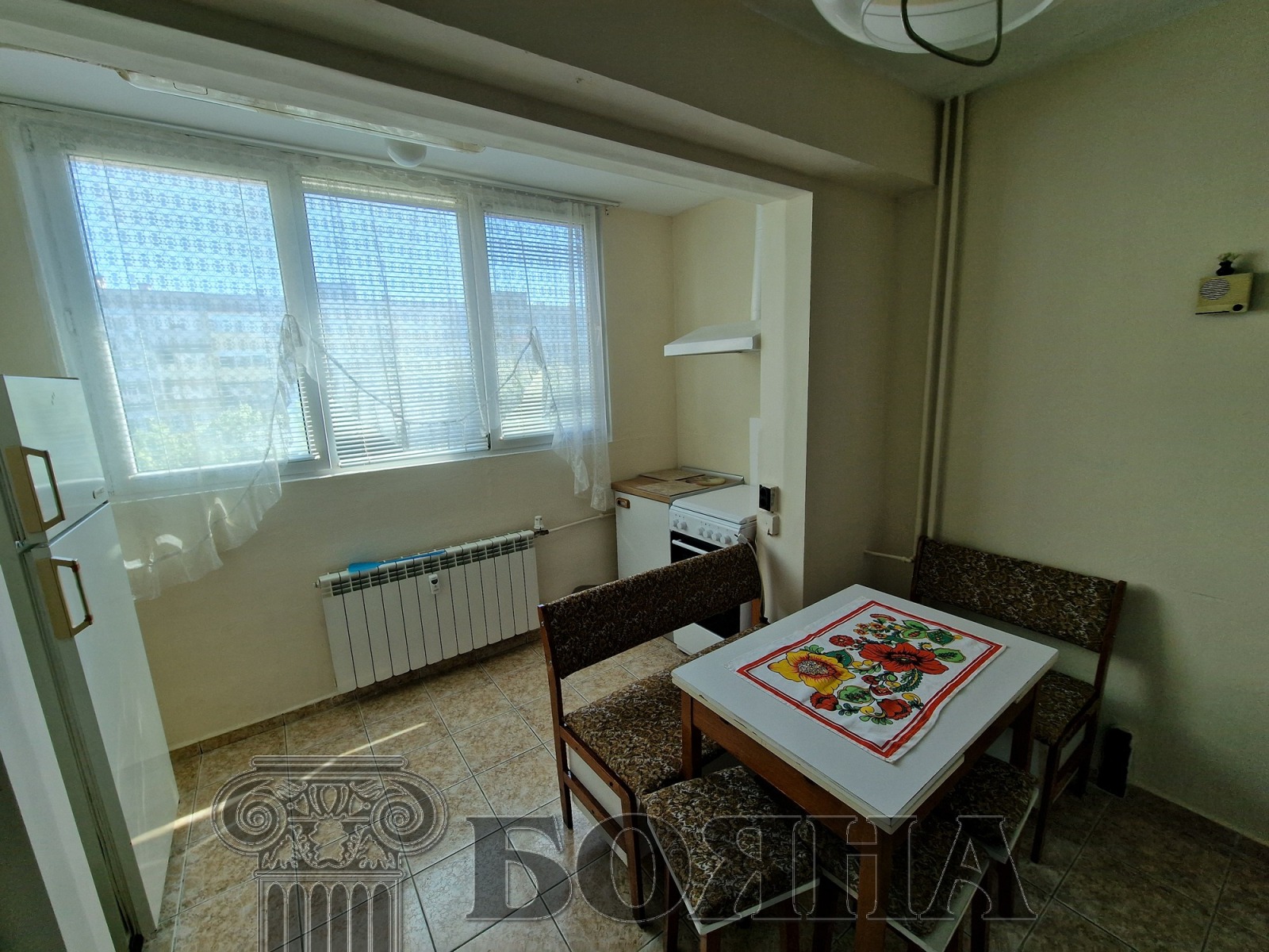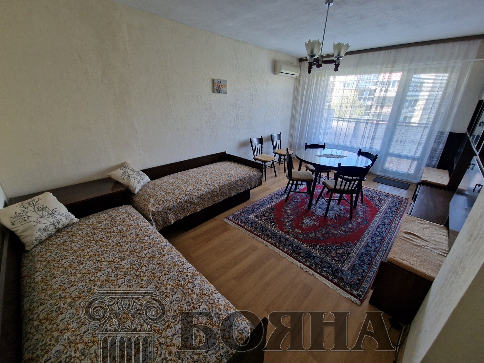 Имоти 'Бояна' отдава под наем двустаен апартамент, в квартал Възраждане, в близост до училище Възраждане. Имотът е просторен, след освежителен ремонт, светъл и топъл. Състои се от: коридор с вграден гардероб, всекидневна, кухня с усвоена тераса, спалня, общ санитарен възел и голяма тераса, с обща площ от 58кв.м. Изцяло подменена дограма на всички прозорци. Подовите настилки са на ламинат в стаите и плочки в банята. Жилището се отдава с наличните мебели и домакински електро уреди: (хладилник, нова готварска печка с котлони, ширм, микровълнова, пералня, бойлер). Отоплението е на ТЕЦ, с нови радиатори в стаите. За охлаждането на жилището се грижат два броя климатици. Топ локация, в близост до парка, детски площадки, градини, спирки и магазини. Контрол на достъпа, асансьор и свободни места за паркиране около блока.