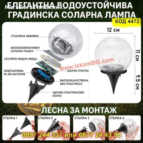 Добавете стил и уют в градината си с тази соларна лампа с ефект на напукано стъкло. Водоустойчива, с автоматично включване при здрач и зареждане чрез слънчевата енергия, тя предлага до 8 часа светлина с минимално усилие. Подходяща за осветяване на пътеки, стълбища или цветни лехи, лампата е лесна за монтаж без нужда от кабели. Създайте перфектната атмосфера на вашата тераса, градина или двор.