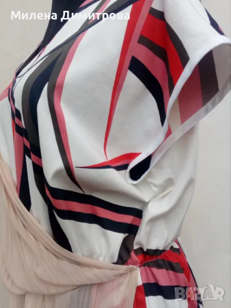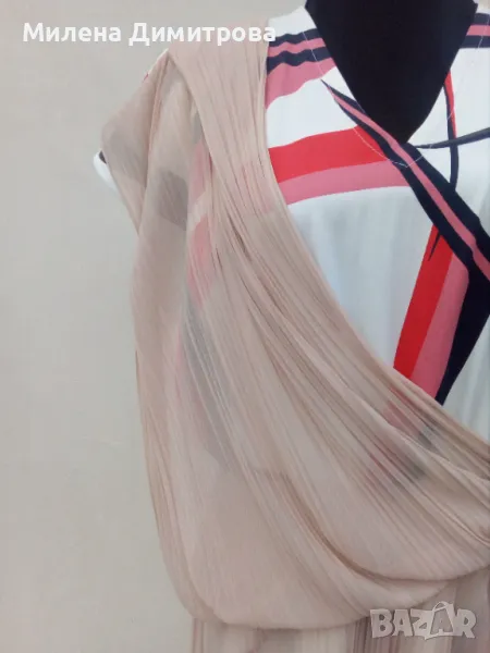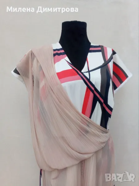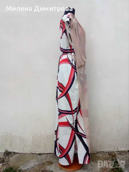 Дълга рокля Абстракт - ръчно изработена от прекрасен сатениран памук с абстрактен принт, гарнирана с плисирана полиестерна материя в прозрачно бежово.
