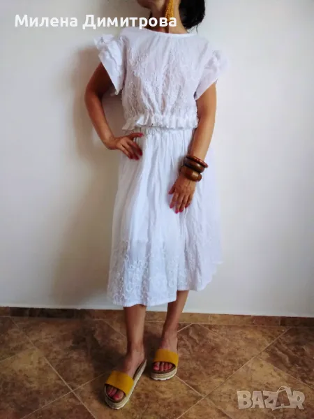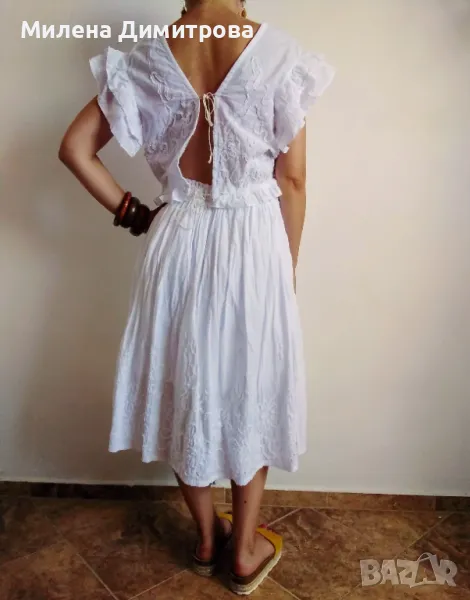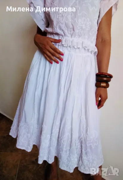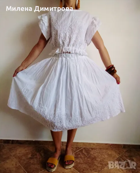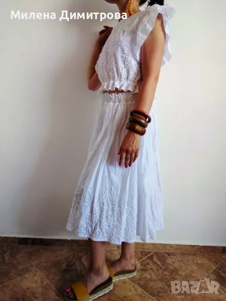 Прекрасен дамски сет - топ и миди пола, ръчно изработени от фин памук с флорални апликации.