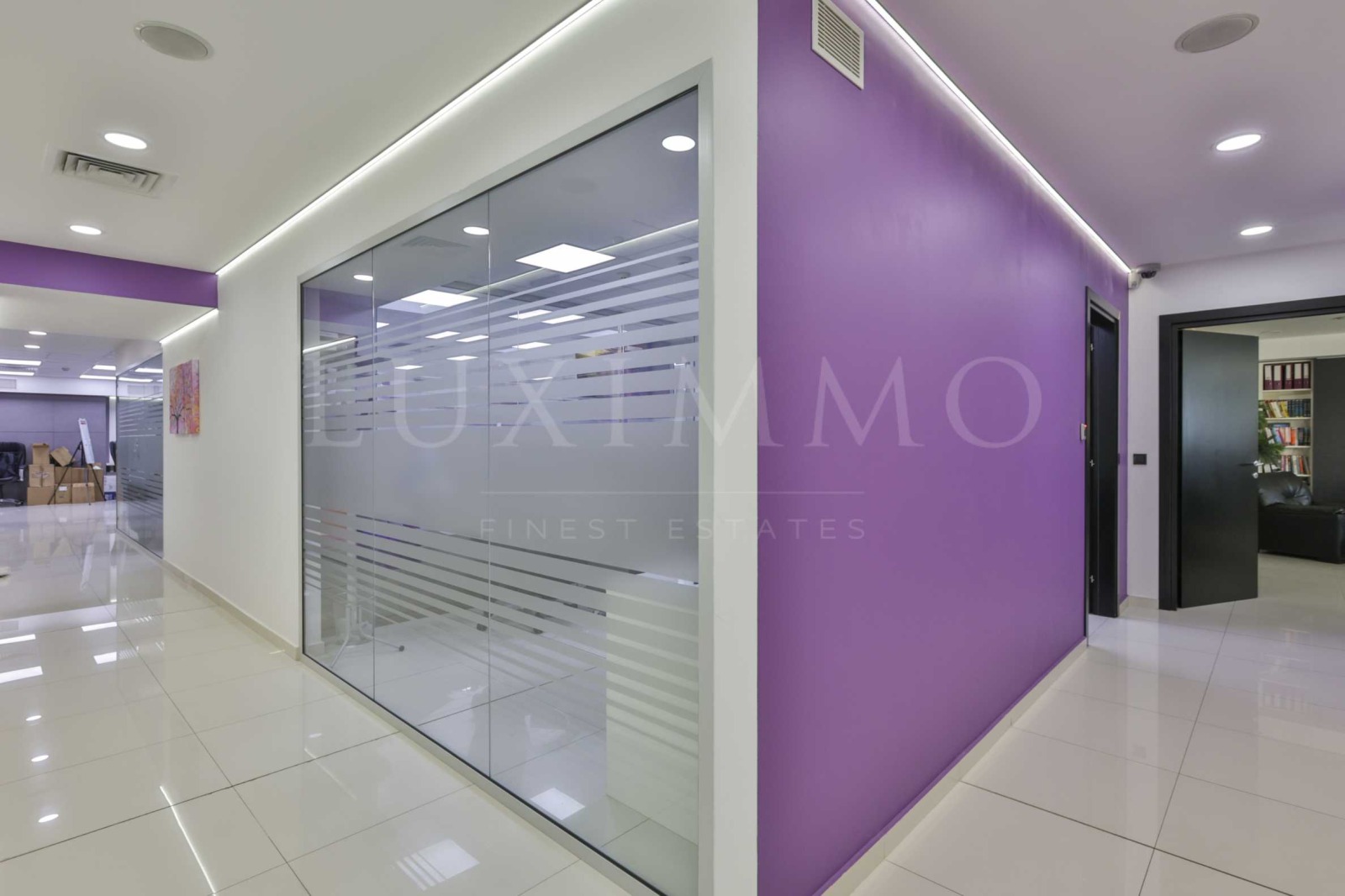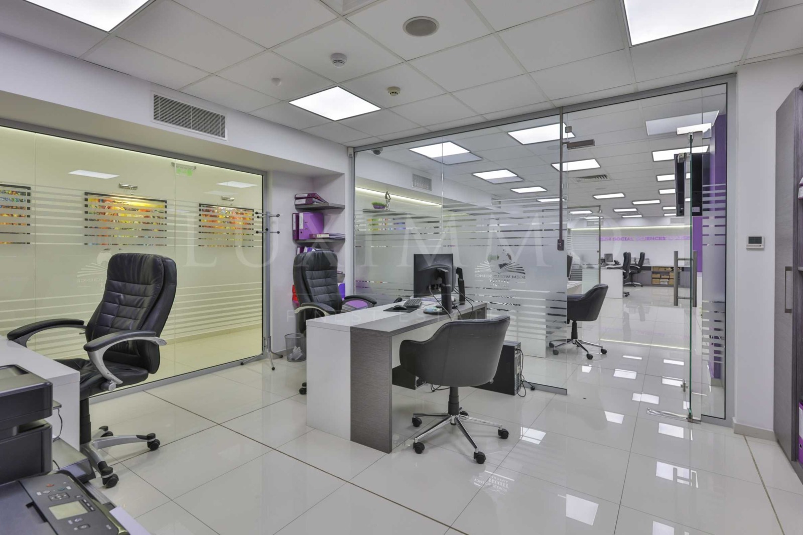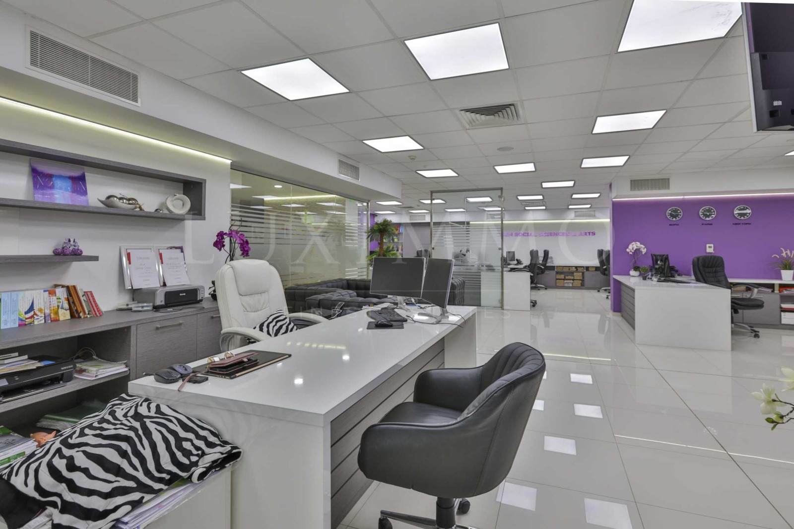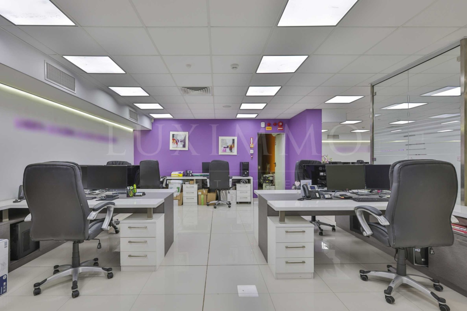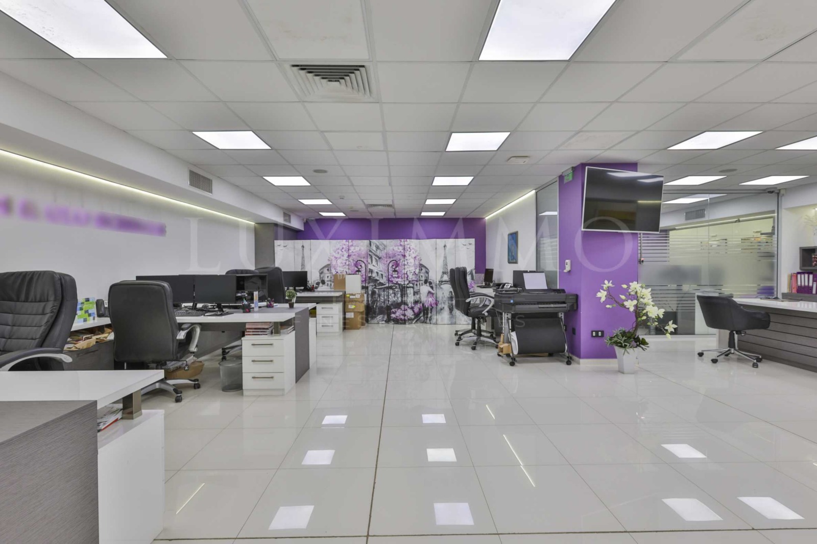 Имотът е изключително подходящ за развиване на бизнес в IT сектора. Разполага с 395 кв.м обща площ, функционално разпределена в две големи обособени пространства, коридор с картинна галерия, водещ към директорски кабинет със заседателна маса, който е оборудван с LED телевизор за презентации, библиотека, картини, кът за гости и релакс. Разполага още с оборудван счетоводен кабинет с две работни места, просторна кухня с обзавеждане и оборудване, 3 обособени тоалетни с предверие и сърварно помещение.