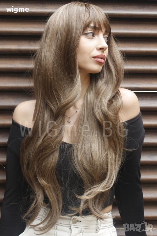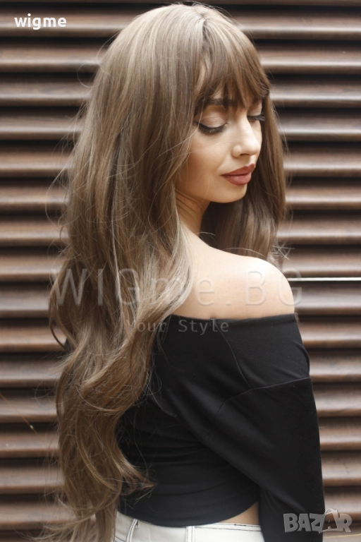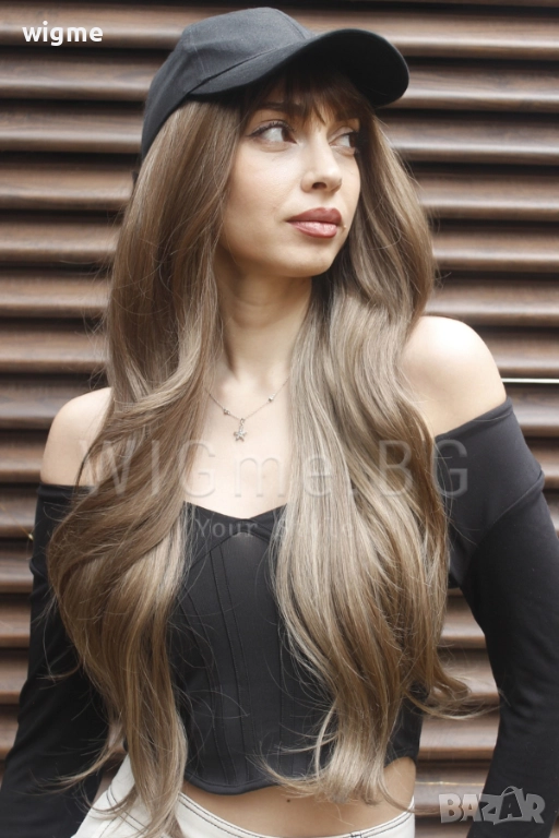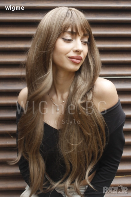 Сега повече от всякога можете да постигнете бързо и лесно преобразяване на визията си с Дълга чуплива тъмноруса перука на светлоруси кичури с бретон Мирея.