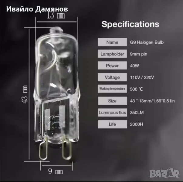 Халогенна крушка за фурна G9 500°. G9 крушка Характеристиките на крушка се виждат от снимките