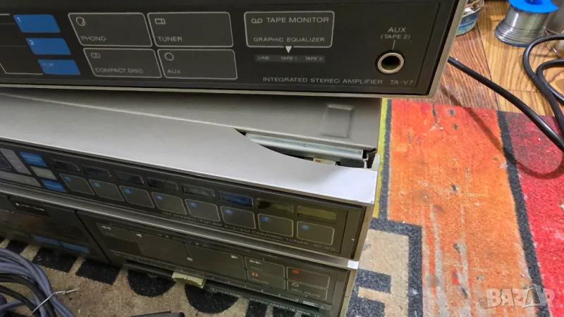 Уредба Сони. За ремонт или части. Усилвателя не включва, тунера има счупване, а декът не плейва, но превърта.
