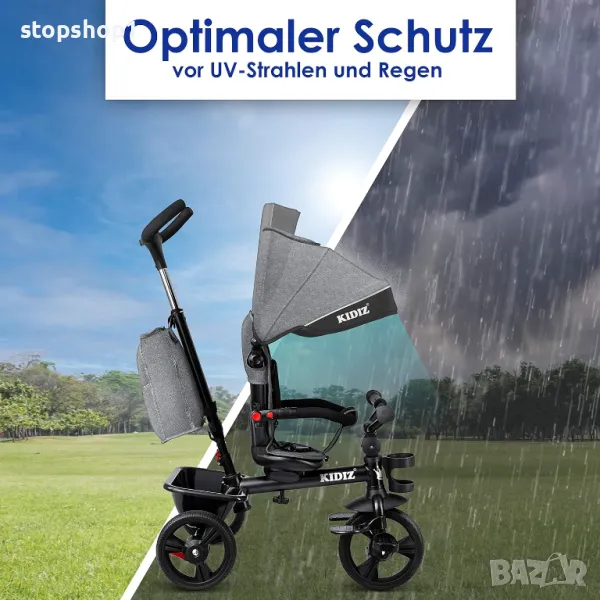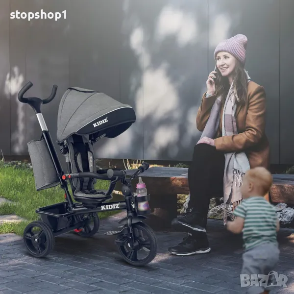 KIDIZ® Триколка 5-в-1 Детска триколка със система за кормилна щанга Бар от 1 година напред и назад Ride Jogger, Кошница Чанта Държач за напитки Сенник Гумени колела, Бъги, Велосипед, Сгъваем