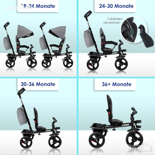 Кормилна щанга: С детската триколка KESSER родителите могат да управляват още по-лесно. Интегрираната система за управление позволява директно управление на предните колела чрез дръжката за бутане. Предпазните решетки на седалката и дръжката за бутане за родителите също могат да бъдат свалени, за да се адаптира триколката към нуждите на растящото дете.