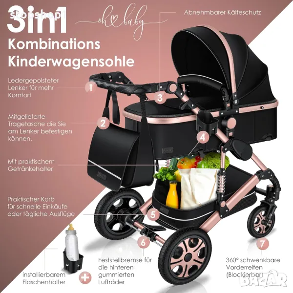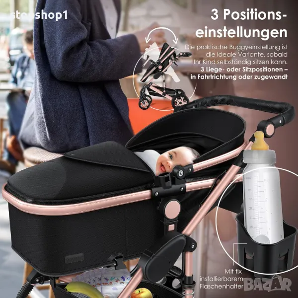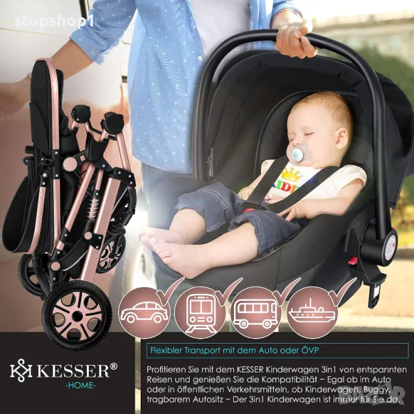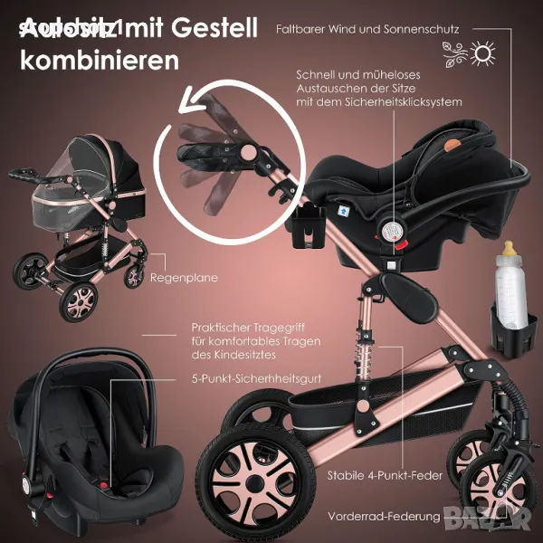 Пълен комплект 3 в 1: Подходящ за бебета от раждането до малки деца. Детската количка 3 в 1 с широка гама от аксесоари ви позволява да получите идеалната мобилност от раждането на вашето дете. Количката е удобна за вашето бебе. Можете да използвате бебешките столчета за кола от първото возене. Благодарение на щракащата система, бебешката седалка се монтира лесно на рамката, не е необходим отделен адаптер. Кликнете върху количката с едно кликване.