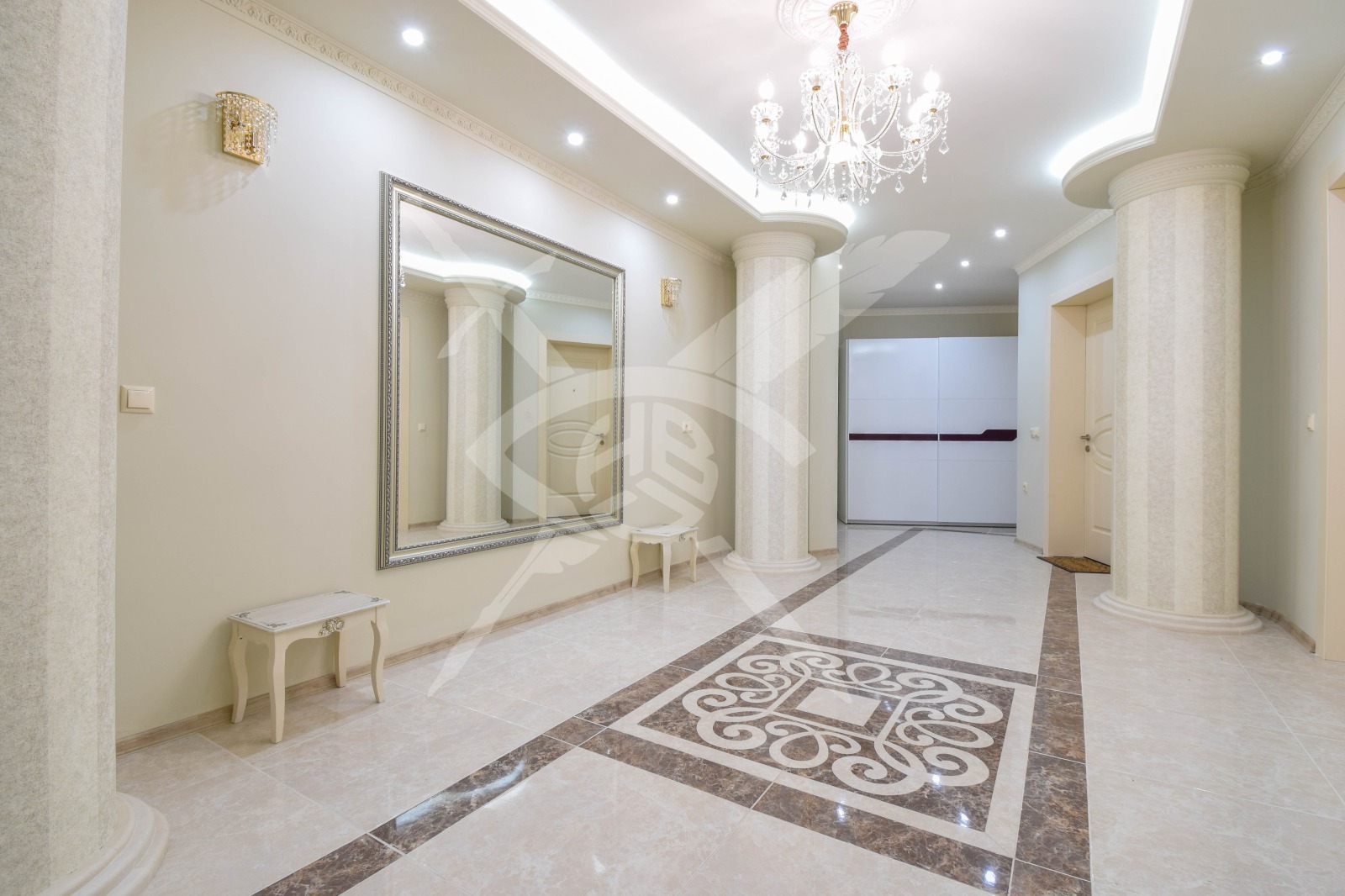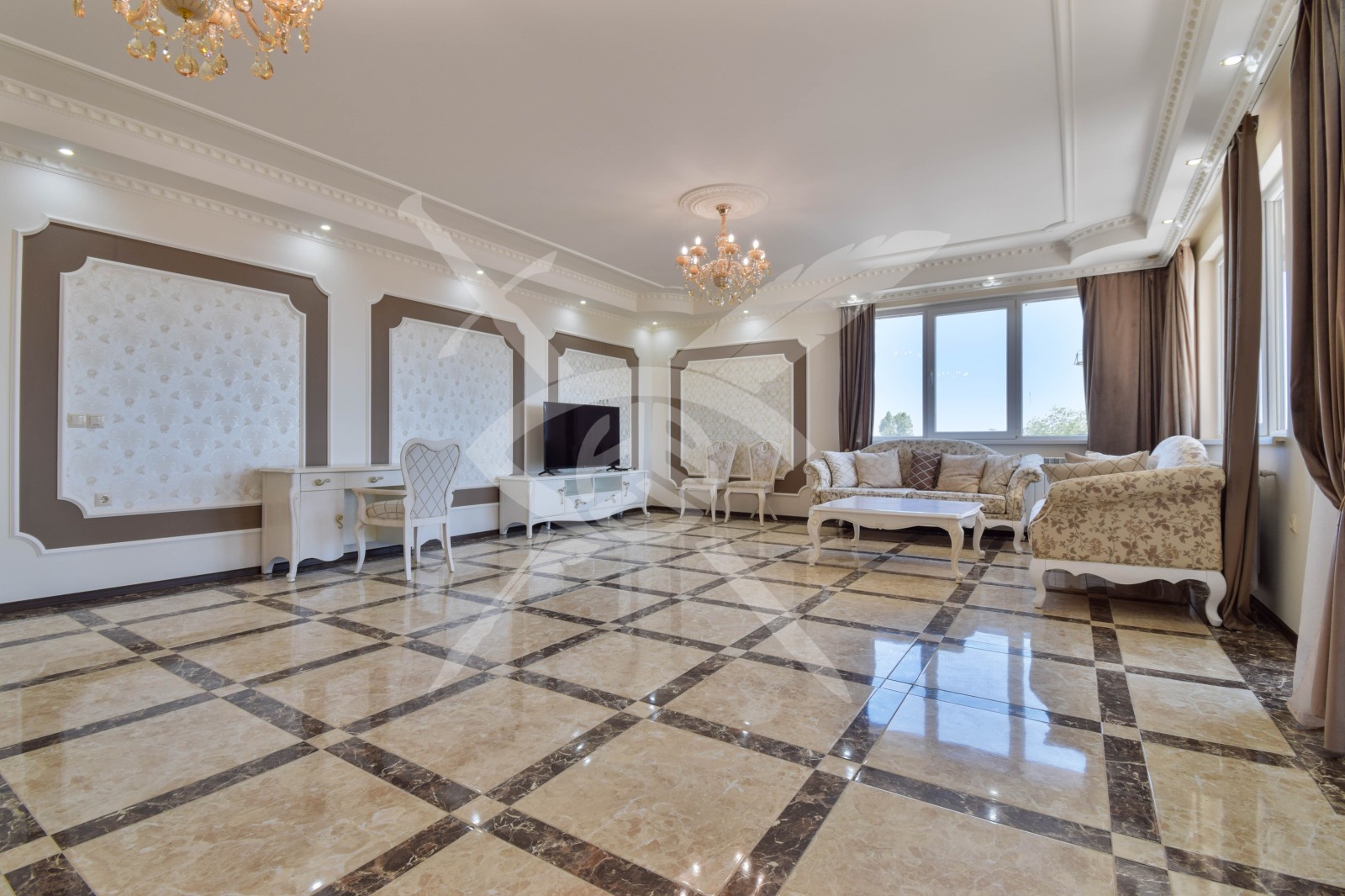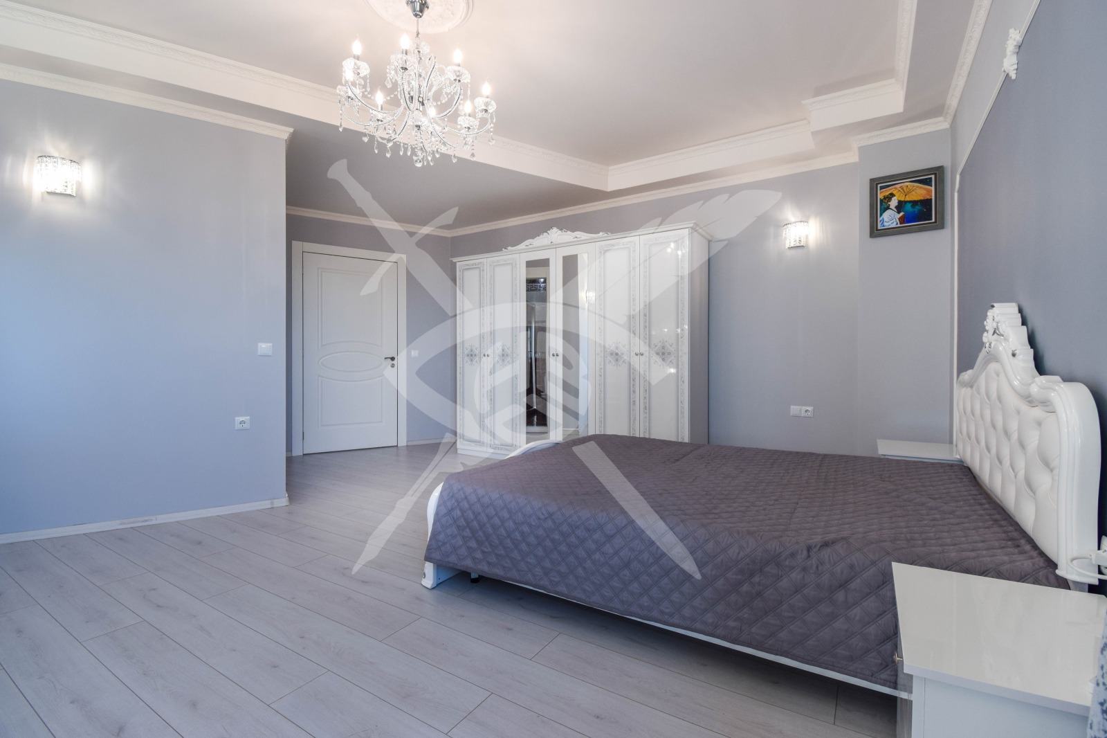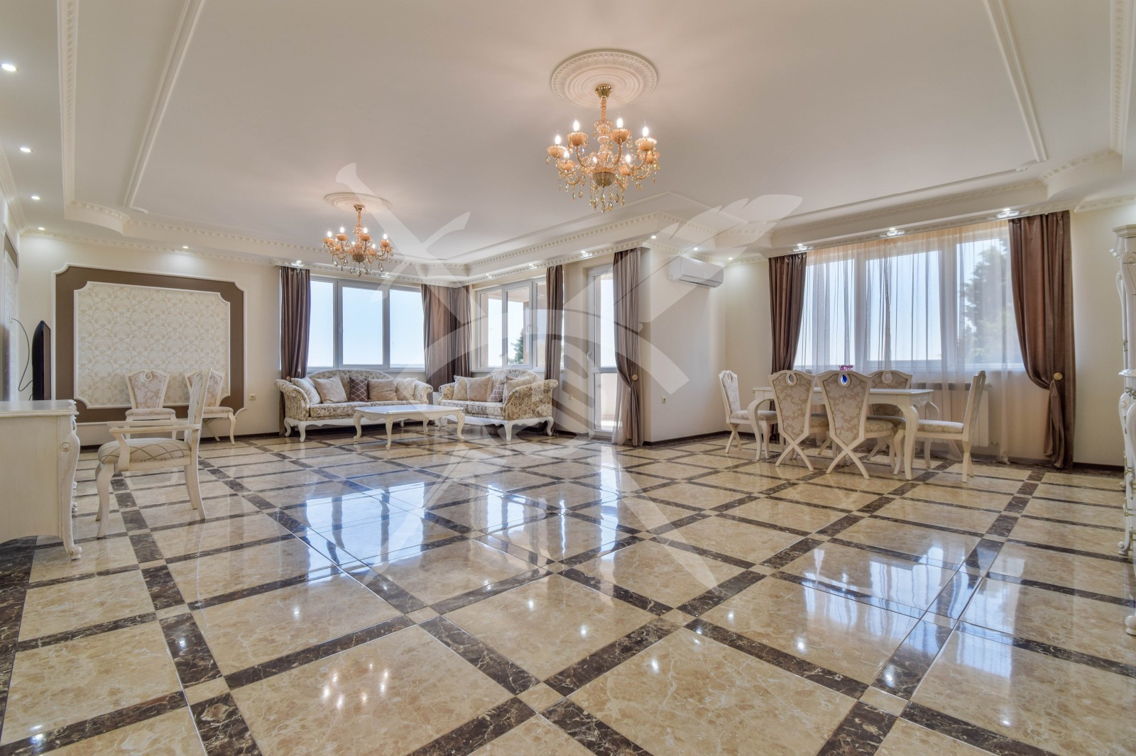 РАЗПРЕДЕЛЕНИЕ: Жилището разполага с площ от 300 кв.м., разпределена във входно антре, кухня с тряпезария, дневен тракт, четири спални с 4 санитарни възела и пет тераси.